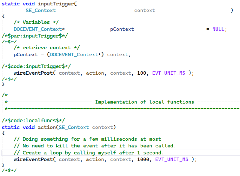 Functions with the correct prototype can invoke themselves via the Event interface, allowing, for example, an LED to be toggled on and off.