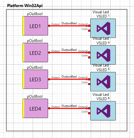 The first image shows an example application that toggles four LEDs. While the platform is unspecified, the application uses abstractions—specifically the OutputBool interface—to control the LEDs by turning them on and off