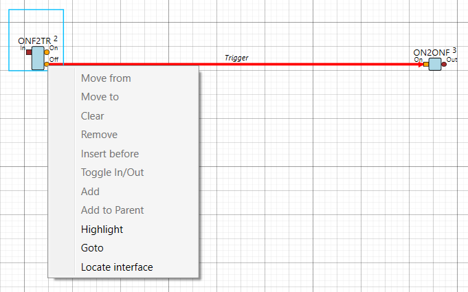 Use the context menu (right mouse click) above an interface connection, like at the Off interface connection in the example at the right.